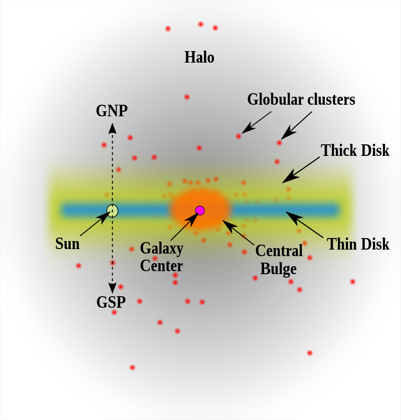 Las regiones del Bulbo, el Halo y el Disco (fino o grueso) pueden apreciarse a través del catálogo NGC.